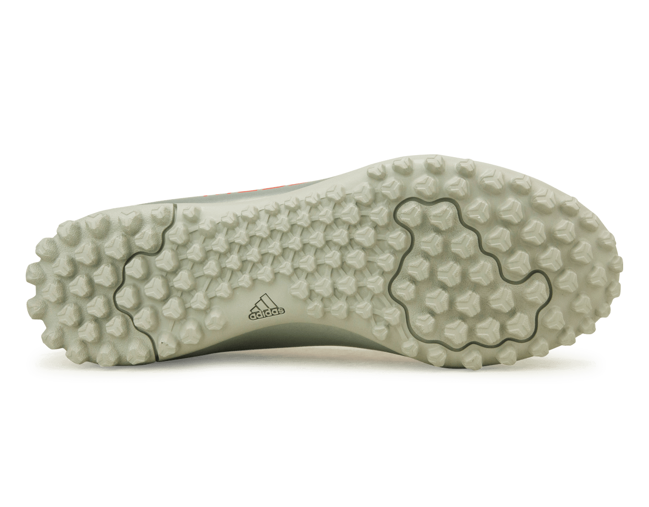 adidas Kids F50 Club Messi TF in White/Red/Silver. Inspired by Messi's legendary play, these youth turf shoes are built to reflect the GOAT's on-field style. They feature a durable synthetic upper and a lightweight tongue for a snug, distraction-free fit. The non-marking rubber outsole is made for quick moves and total control on flat indoor surfaces. Plus, they're made with at least 20% recycled materials for a more sustainable choice.