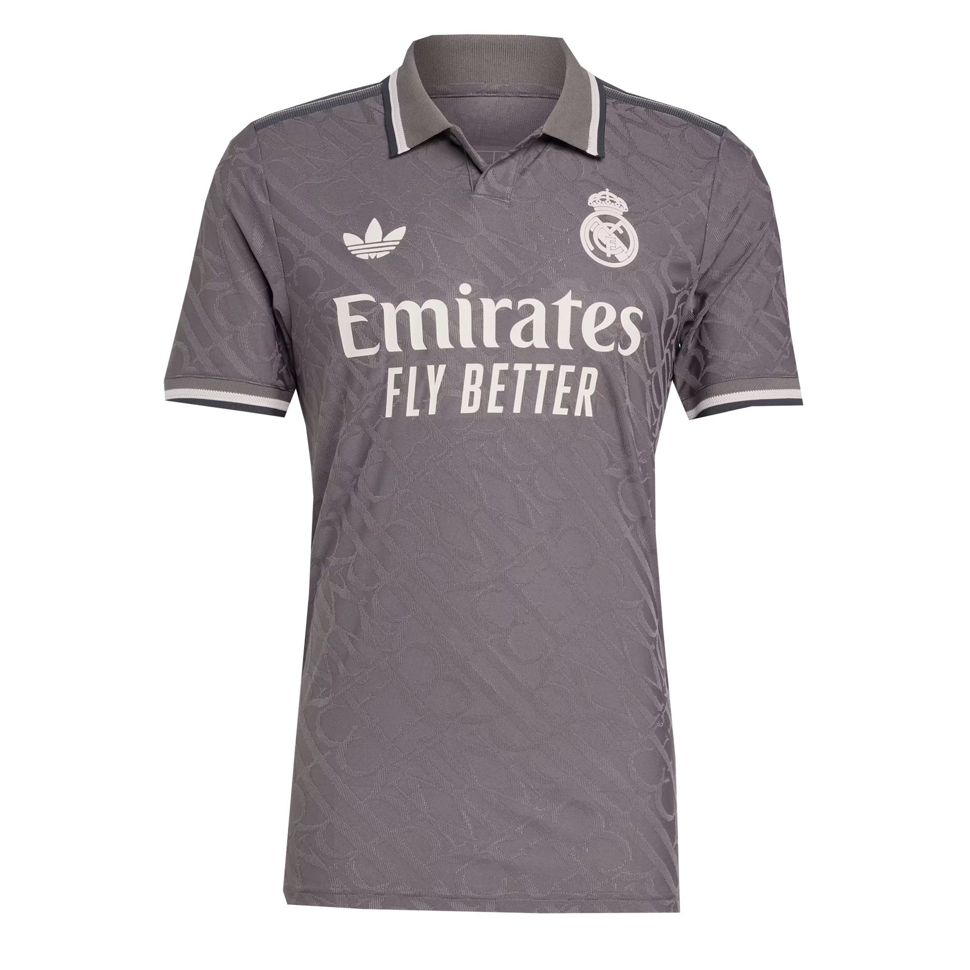 The adidas Men's Real Madrid 2024/25 Authentic Third Jersey in Charcoal exudes elegance with embossed "RMCF" monograms inspired by classic Madrid street signs. This design marks the return of the iconic Trefoil logo on an adidas match shirt. AEROREADY technology keeps fans dry and comfortable while they show their support.