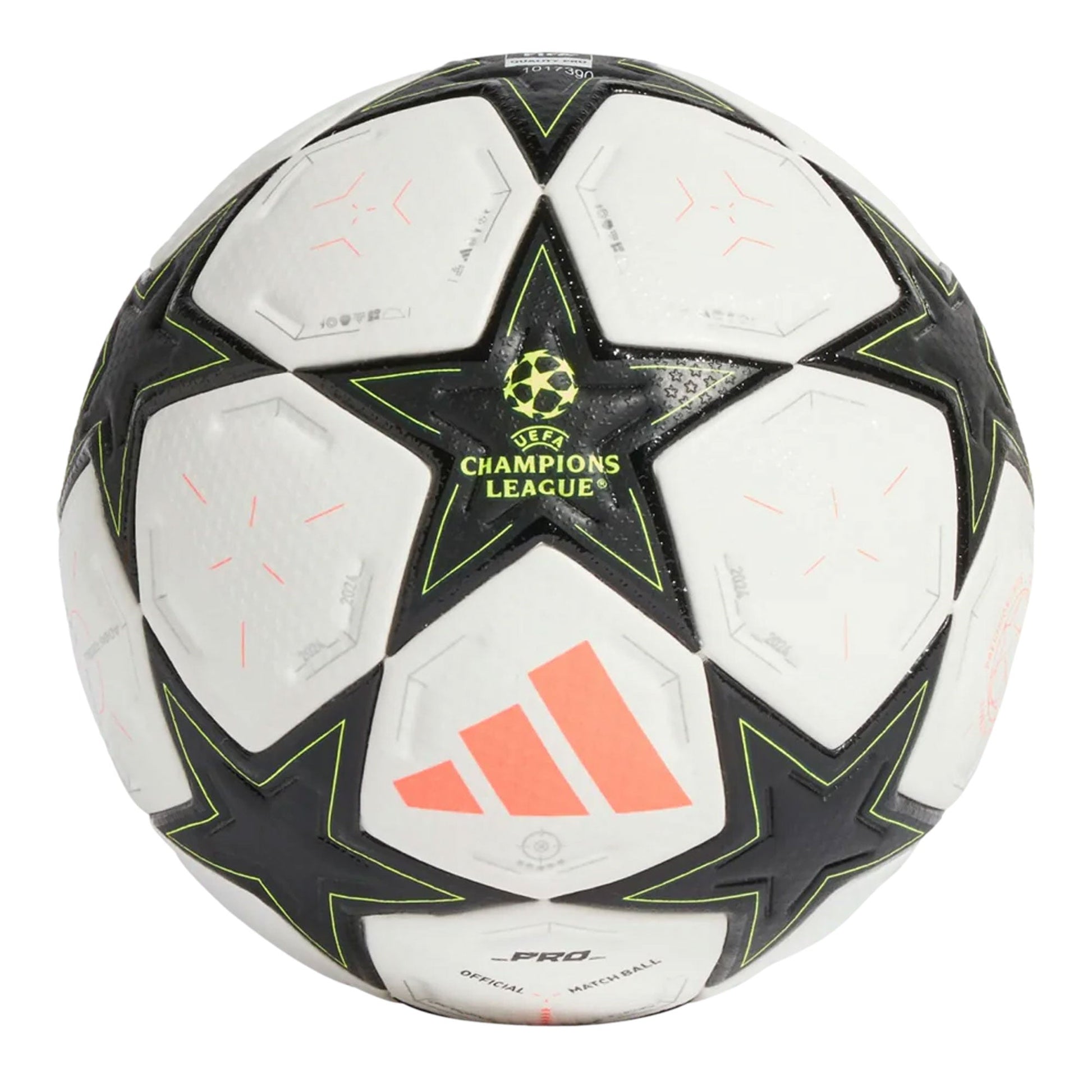 Celebrating the emergence of a new star, the adidas UCL Pro 2024/25 League Phase Ball in White/Aurora Black/Platinum Metallic features a classic black-and-white design with star-shaped panels connected at their tips. As the official match ball for the tournament's 24/25 league phase, it boasts a seamless construction and embossed details for superior performance. The Quality Pro stamp signifies FIFA's highest seal of approval.