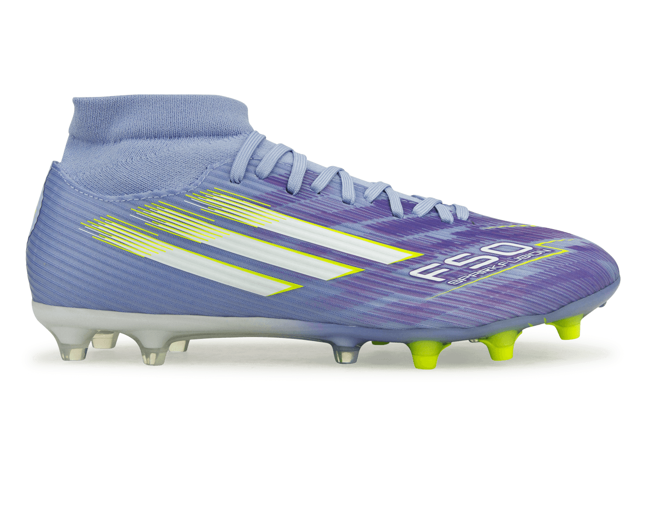 The adidas Women's F50 Sparkfusion League FG/AG in Violet/Lemon/Purples soccer cleats, built specifically for female athletes. Featuring a soft Fiberskin upper for all-game comfort, a women-specific fit, and a Sprintplate Fusion outsole tuned to support female biomechanics, these cleats are made to elevate your play on firm ground and artificial turf.