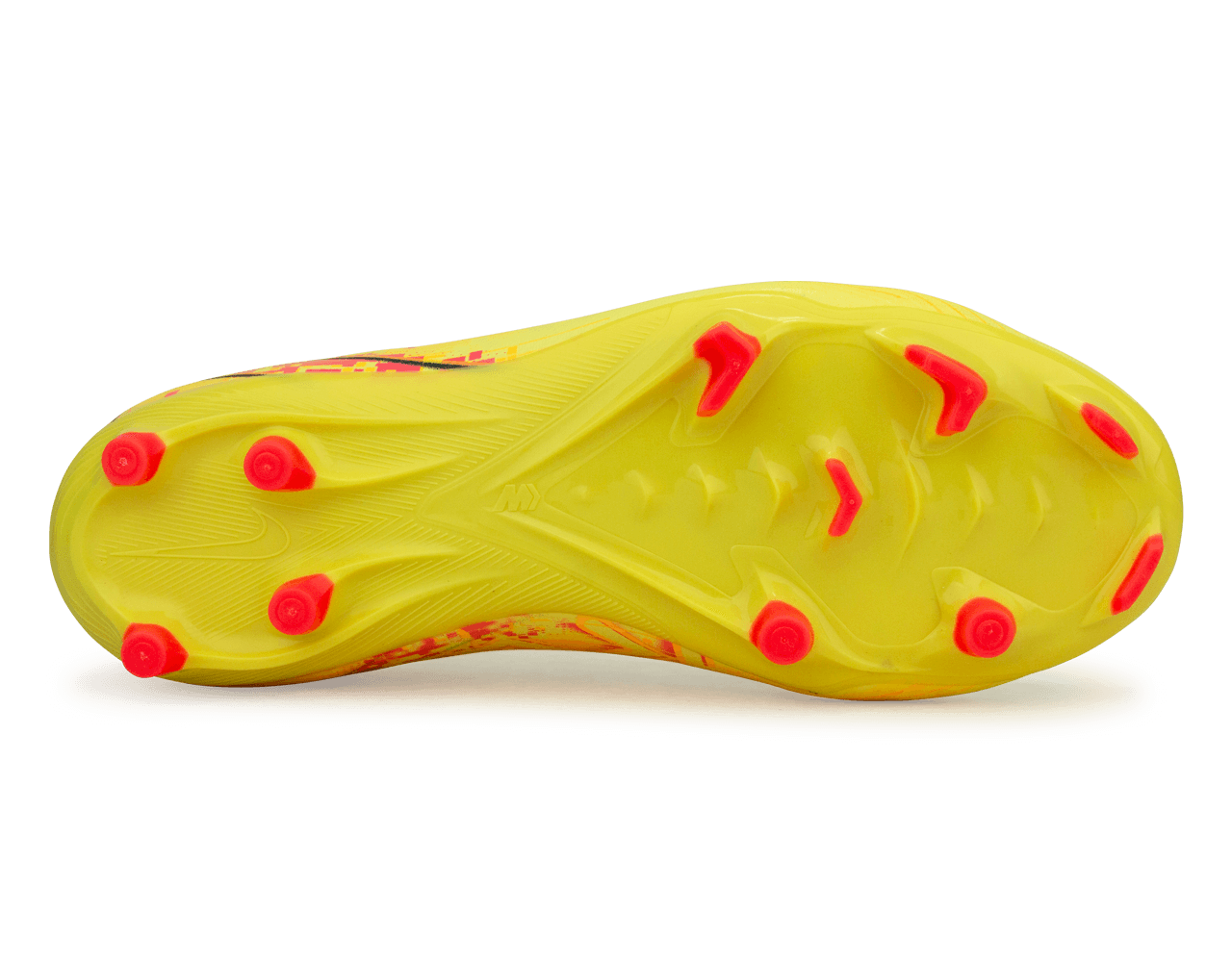 The Nike Kids Zoom Mercurial Superfly 10 Academy "Kylian Mbappe" FG/MG in Laser Orange/Armory Navy features an enhanced heel Air Zoom unit for better propulsion and speed. Its NikeSkin upper with embedded chevrons provides excellent ball control, simulating a barefoot feel, making it the most responsive Mercurial model for optimal field performance.