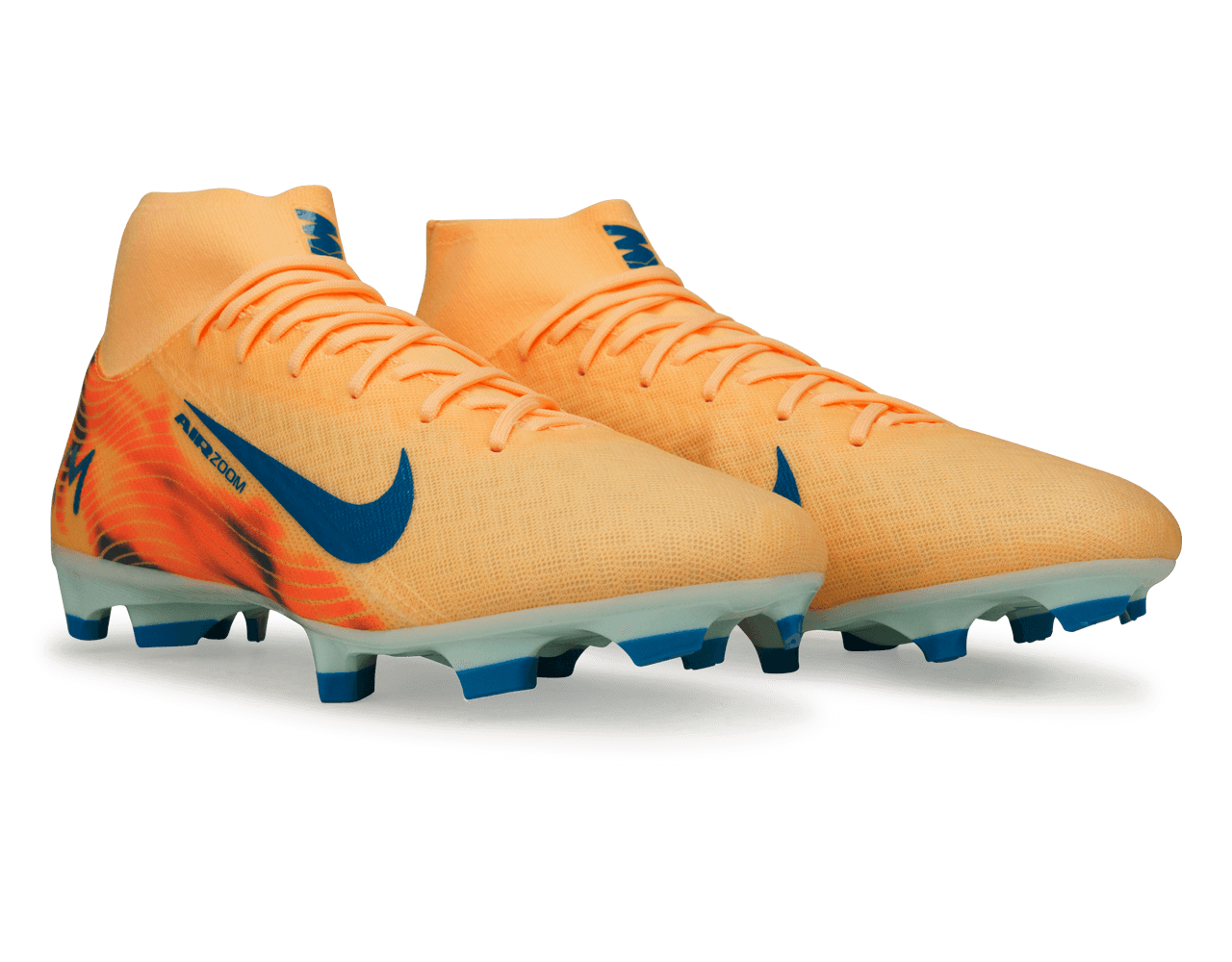 Elevate your performance with the Nike Men's Zoom Mercurial Superfly 10 Academy 'Kylian Mbape' FG/MG in Melon Tint/Neo Turq Igloo. Engineered for explosive speed, these cleats feature an upgraded heel Air Zoom unit for lightning-fast responsiveness. The NikeSkin upper, reinforced with embedded chevrons, delivers exceptional ball control and a barefoot-like, close-to-foot touch.