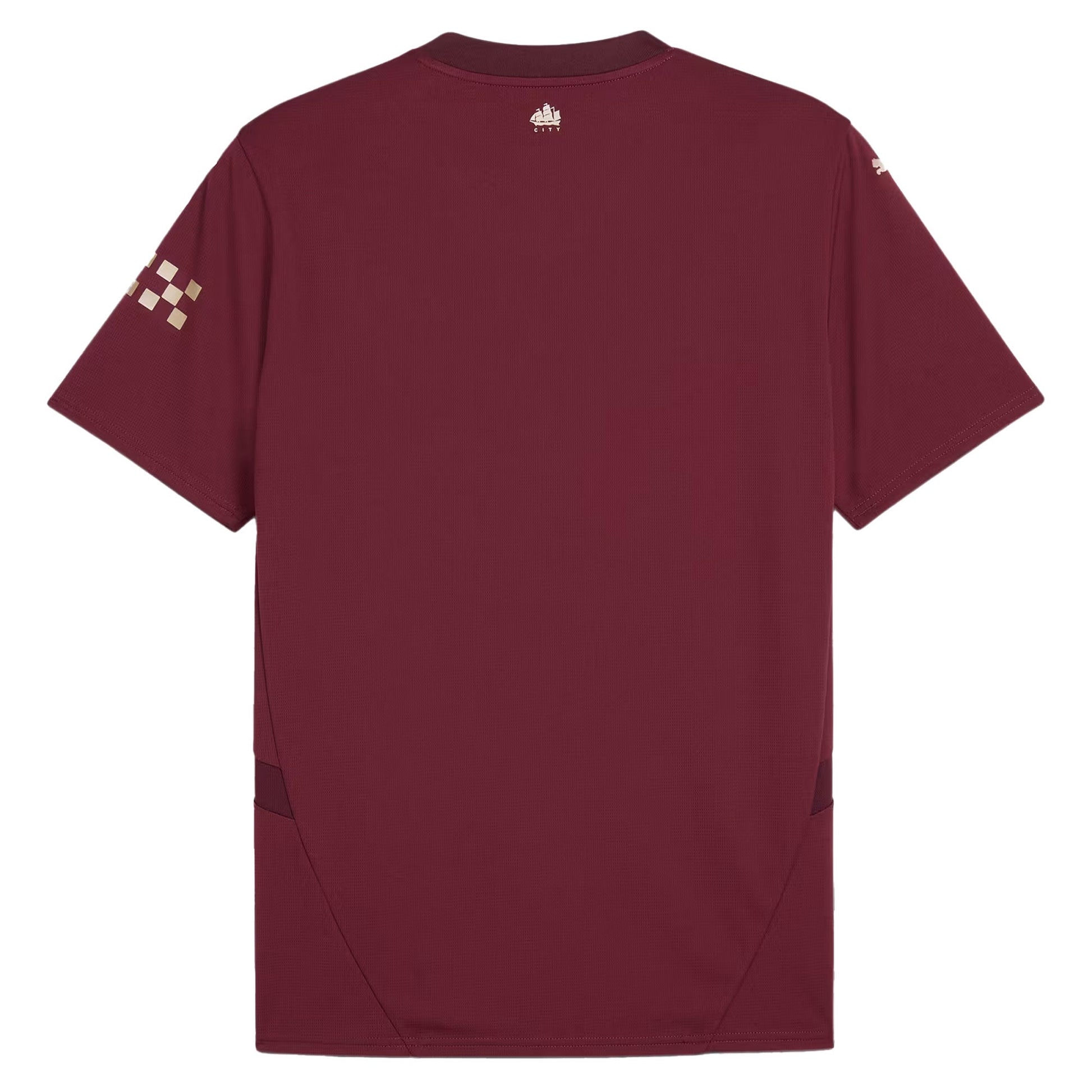 The PUMA Men's Manchester City 2024/25 Third Jersey in Dark Jasper pays tribute to the club's constant movement on and off the pitch. The jersey features an all-over graphic inspired by the ship from the Man City badge, symbolizing the club's past, present, and future. Designed for fans, this replica jersey combines the match-worn look with a casual silhouette, perfect for both game day and everyday wear.