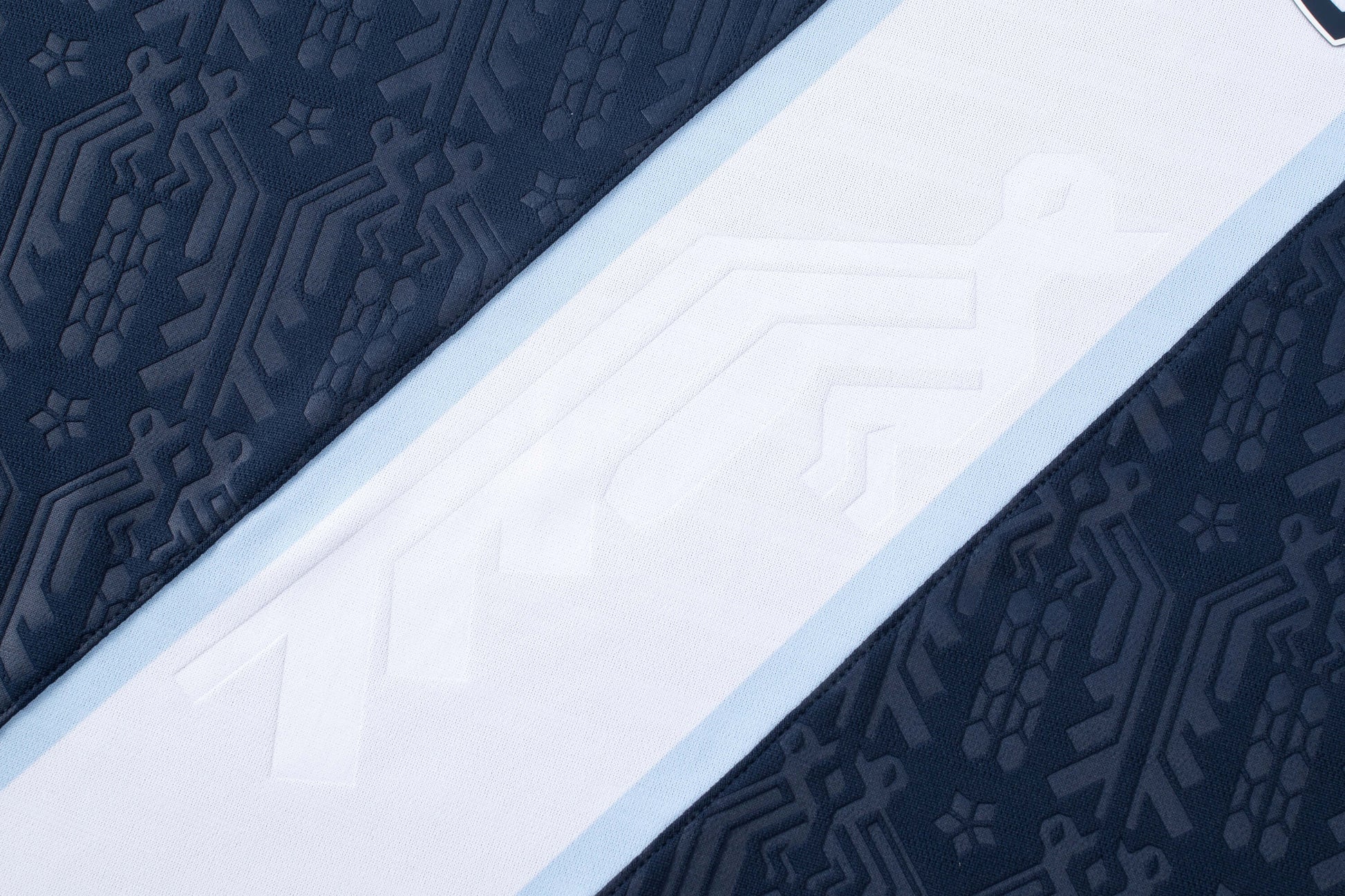 - A white and sky blue diagonal stripe runs across the chest, maintaining the iconic national look